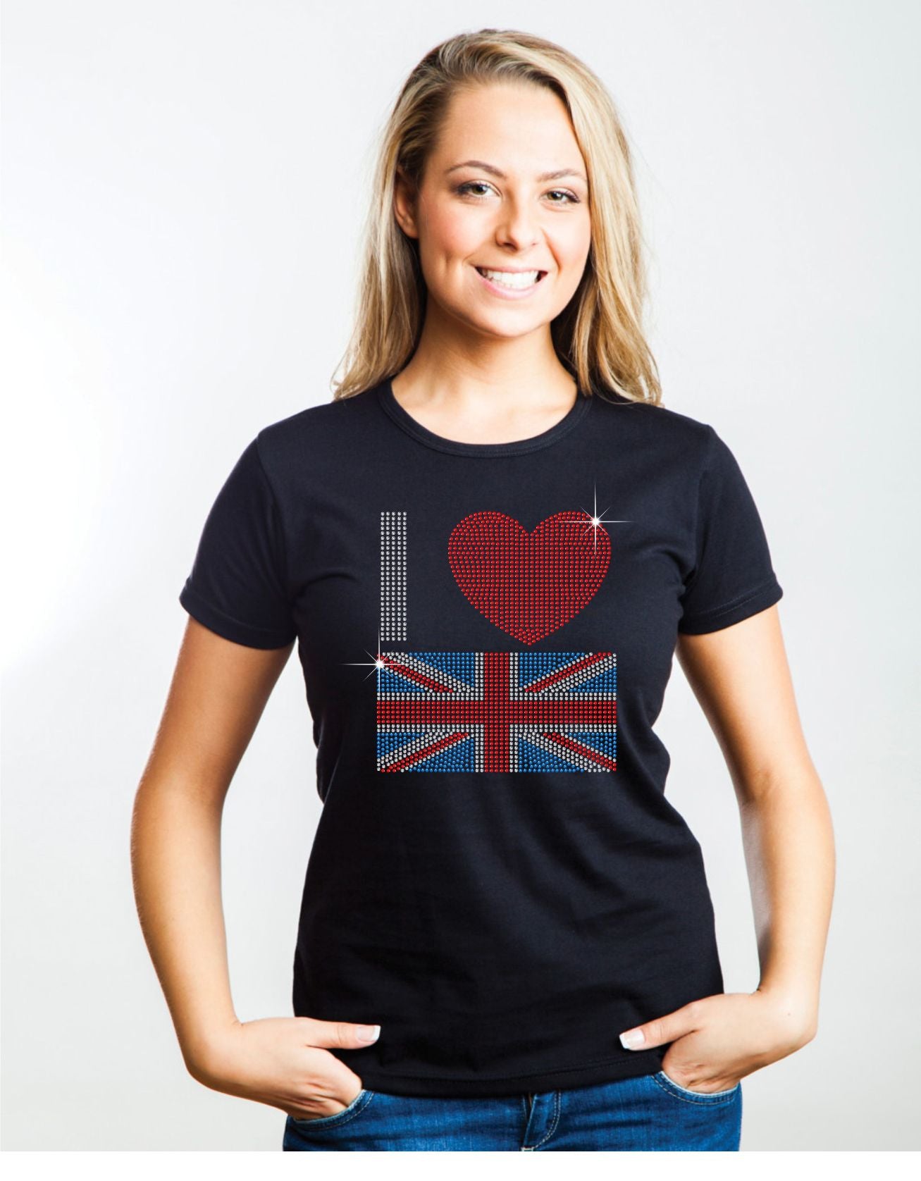 I Love GB Union Jack Hotfix Rhinestone Transfer Diamante Motif, Iron on Applique